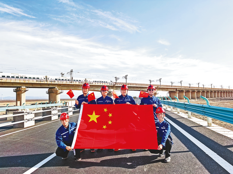 国庆假期,中铁一局G30连霍高速哈吐9标项目部管服人员56人,作业人员594人,共同面对吐鲁番百里风区极端天气考验,全力推进路基、桥梁等全线关键节点工程建设。图为项目员工开展“我和国旗合个影”活动。