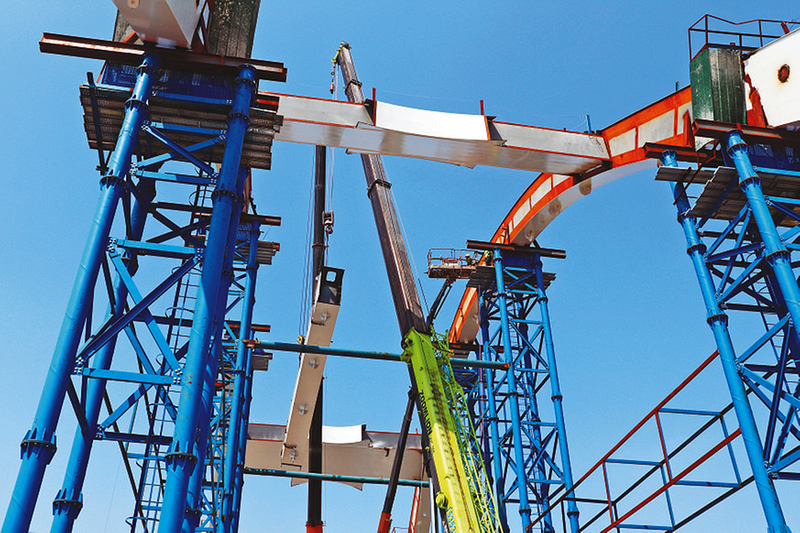这座管道桥主桥采用四跨钢箱拱结构,单跨105米,如同四道钢铁彩虹。施工团队在强风环境下完成9个大型钢箱节段的高空精准对接,最重达20.4吨。技术团队采用实时监测技术,时刻感知结构变化。