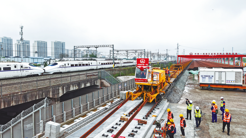 本报重庆讯 4月3日,在重庆市涪陵区涪陵北站施工现场,随着现场作业人员操作新型多功能长钢轨牵引车,将首对500米长钢轨平稳铺设在无砟轨道道床上,标志着由中铁一局参建的渝万高铁铺轨施工正式拉开帷幕,向着建成通车目标迈出关键一步。